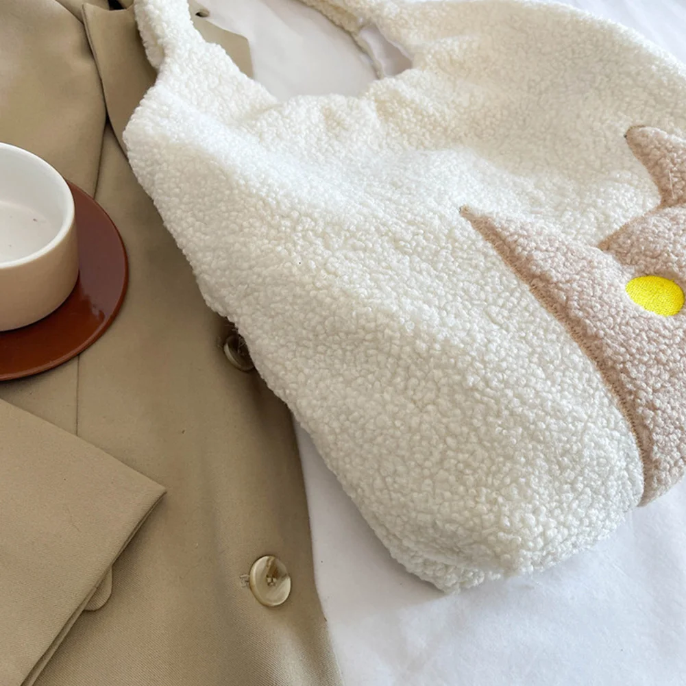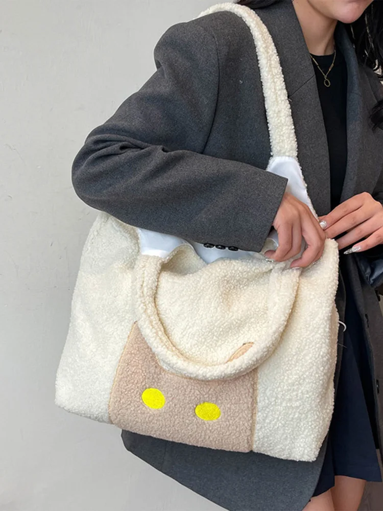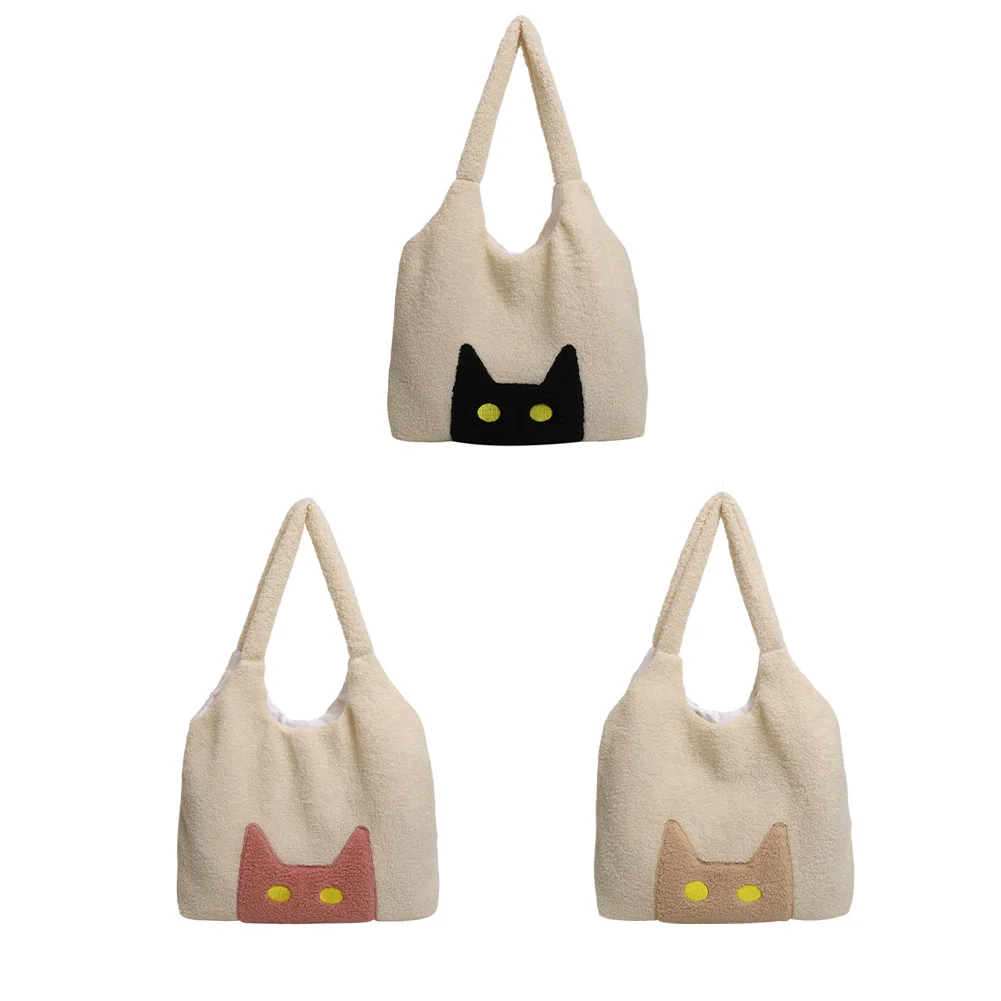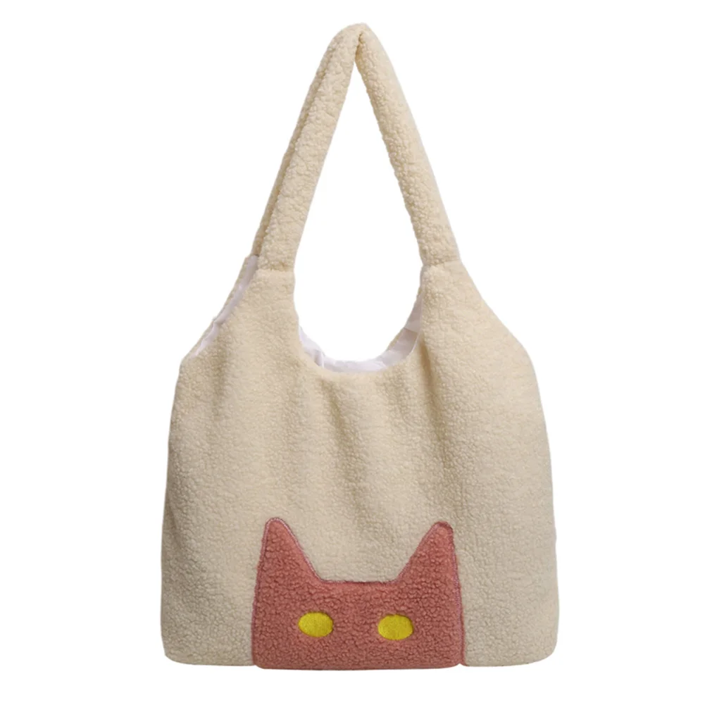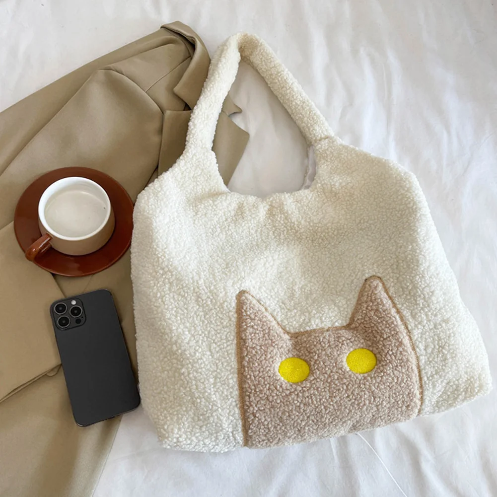 Women Lambs Wool Plush Tote Bag Cute Cat Shoulder Bag Large Capacity Tote Handbag Fluffy Purse Shopping Dating Bag